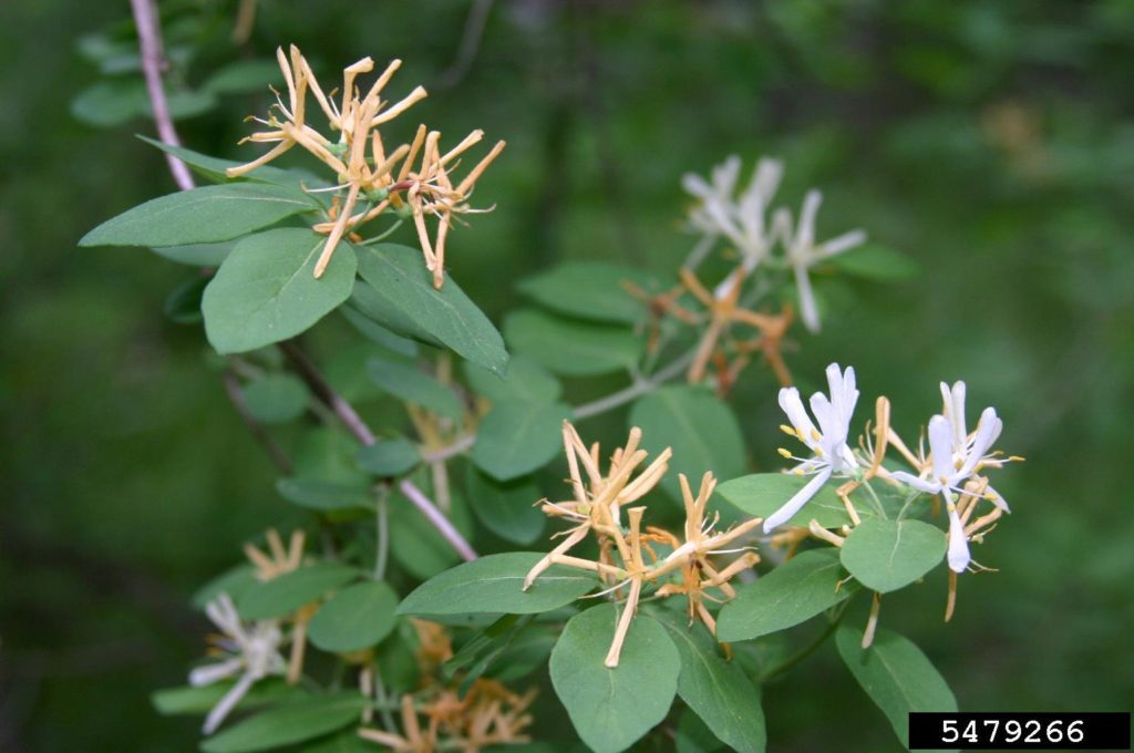 Native bush honeysuckles found in New York include American Fly Honeysuckle and Northern Bush-honeysuckle. A good way to tell native from invasive is by their stems: native species have solid stems, while the mature stems of invasives are hollow. Types of invasive bush honeysuckles found in New York are Amur, Morrow’s, Tatarian, and Japanese. Berries are generally red or reddish-orange.