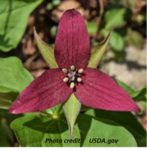 ![]() Red Trillium: Native; found in damp, shady forests; aka “stinking Benjamin” for odor that attracts carrion flies for pollination; protected by law (look, don’t pick!) Photo credit: USDA.gov |